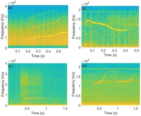 The whistle is a frequency modulated signal whose frequency changes with time and has harmonic characteristics. Using the STFT algorithm to analyze the time–frequency characteristics, according to the time-varying trend of the TFC of a whistle signal, there are four categories of whistle, namely up-sweep whistle, down-sweep whistle, flat-sweep whistle and sinusoidal whistle, as illustrated in Figure 2. The original whistle contains noise and higher harmonics.
