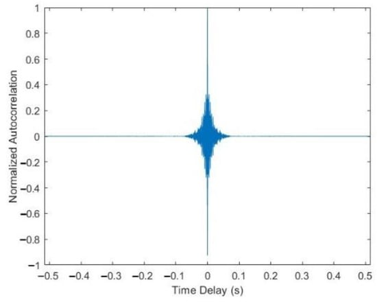 The normalized autocorrelation of the whistle shown in Figure 3a is illustrated in Figure 4. From Figure 4, we observe that the autocorrelation peak of the bottlenose dolphin whistle is sharp and prominent, which means that it has a good autocorrelation characteristic. Hence, the BC-UAC method proposed in this paper uses the original whistle as the synchronization signal.