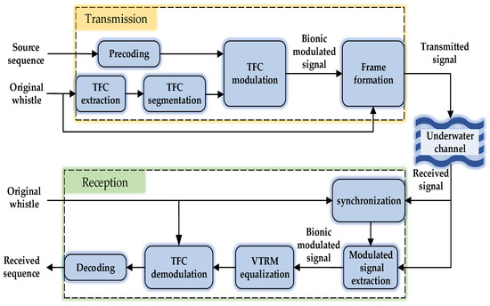 In order to improve the concealment and effectiveness of the constructed bionic communication signal, a BC-UAC method based on the TFC of the bottlenose dolphin whistle is proposed. First, the TFC of the bottlenose dolphin whistle is extracted by the short-time Fourier transform (STFT) algorithm and smoothed by the Sage–Husa adaptive Kalman filter (SHAKF) algorithm. Second, the transmitted information bits are modulated to the TFC, where the TFC is processed as segments to improve the communication rate. Two BC-UAC schemes based on the segmented TFC of the bottlenose dolphin whistle, namely the BC-UAC scheme using the whistle signal with time-delay (BC-UAC-TD) and the BC-UAC scheme using the whistle signal with frequency-shift (BC-UAC-FS), are presented. In the proposed BC-UAC schemes, the information bits are represented by time-delay and frequency-shift to obtain the bionic modulated signal after modulation. Furthermore, an improved orthogonal matching pursuit (IOMP) algorithm is addressed to estimate the channel with unknown sparsity, and virtual time reversal mirror (VTRM) technology is used to perform channel equalization. The performance of the proposed BC-UAC method is evaluated with simulated and measured underwater channels, respectively. Numerical results show that the constructed bionic communication signals have good concealment. The two BC-UAC schemes have good performance in terms of covertness and reliability. In addition, the covertness of BC-UAC-TD is better than that of BC-UAC-FS, although the reliability of BC-UAC-TD is worse than that of BC-UAC-FS.