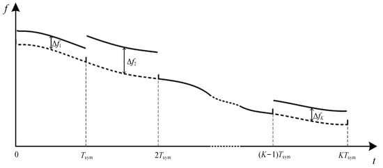The time-delay of the k-th symbol is τk = bkT0, where bk is the k-th element of the coded sequence, and k = 1, 2, …, K. The frequency offset to characterize the time-delay in BC-UAC-TD is illustrated in Figure 7.