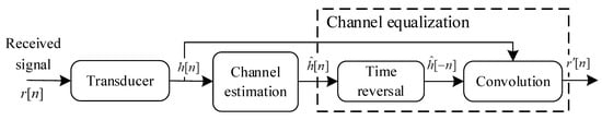 At the receiver, the multipath signals with different attenuations and delays are superimposed, which will introduce inter-symbol interference. In order to alleviate the influence of the multipath effect, the VTRM technique [] combined with an IOMP algorithm is adopted for the channel equalization. The workflow of the channel estimation and equalization in the proposed BC-UAC method is illustrated in Figure 9, where the IOMP algorithm is used for the channel estimation, and the estimated results are used for the channel equalization.