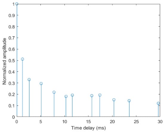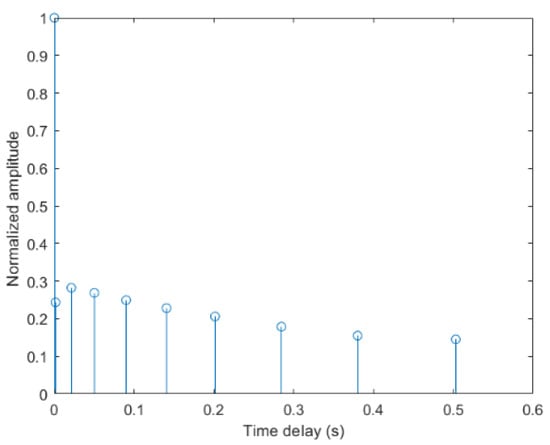 The parameter settings of the BELLHOP channel are listed in Table 4, and the corresponding normalized CIR is illustrated in Figure 10. In the simulated shallow water channel, the largest time-delay of the multipath is about 0.5 s, and its amplitude is about 0.15.