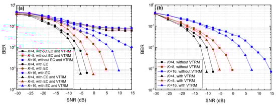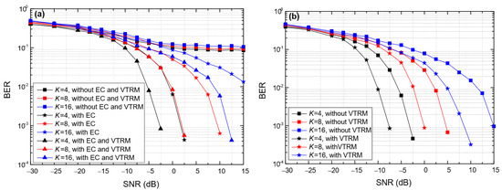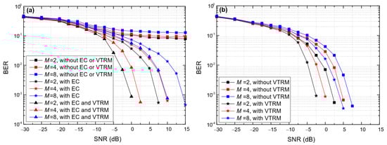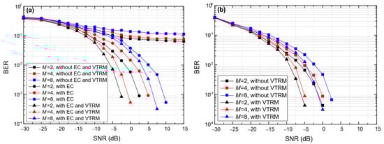 From Figure 17, we observe that as the performance of the proposed BC-UAC method, in terms of the BER, decreases as M increases. However, the performance is improved using the VTRM equalization module at the receiver. Moreover, the influence of M on the performance of BC-UAC-TD is larger than that of BC-UAC-FS.