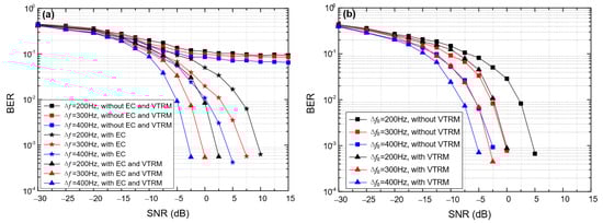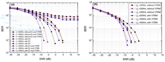 The impact of the frequency offset on the BER of the proposed BC-UAC method under the measured channel. (a) BC-UAC-TD (∆f); (b) BC-UAC-FS (∆f0).