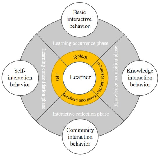 As shown in Figure 2, in order to reflect the process of E-learning and the interaction between learners and different objects, this article is based on the classification of Sun [24] and Wu [25], and divides the interaction between learners and interactive objects in the process of E-learning. For basic interaction behavior, knowledge interaction behavior, community interaction behavior and self-interaction behavior, each type of learning behavior corresponds to a different learning stage. The following are the four learning behavior categories classified according to the EBC Model: