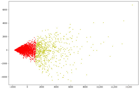 Finally, principal component analysis (PCA) is performed on the characteristics of students’ E-learning behaviors to reduce the dimension of students’ E-learning behavior characteristics to two dimensions, and then perform visual analysis. Then, as can be seen from Figure 4, it is found that the difference of the distance of the student features of the red class is small, and the maximum value should be adopted for better fusion effect, that is, = 1; the difference of the distance of the student features of the yellow class is large, and the mean value should be adopted to achieve a better fusion effect, that is, = 0.