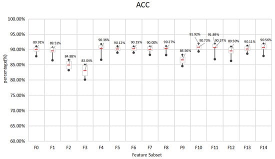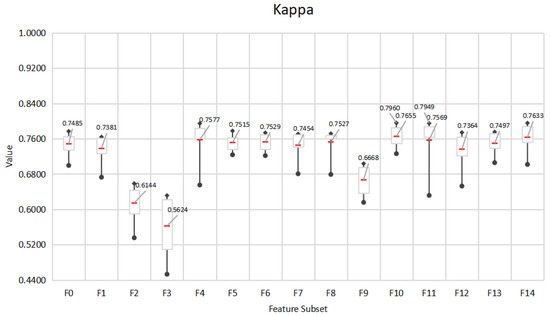 This paper designs an E-learning behavior feature set based on the EBC Model. In order to explore the impact of different behavior feature subsets on the prediction effect of learning performance, the performance of 7 different classification methods is used and compared. The performance of the feature subset under the seven algorithms is shown in Figure 5, Figure 6 and Figure 7. The experiment adopts the five-fold cross-validation method, and the values of accuracy, F1-score and kappa are the average values of the five-fold cross-validation. Figure 5, Figure 6 and Figure 7 show the maximum, upper quartile, mean (red in the figure), lower quartile, and minimum of the predicted effects of the seven algorithms.