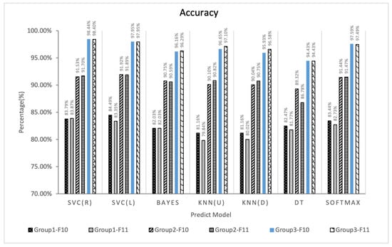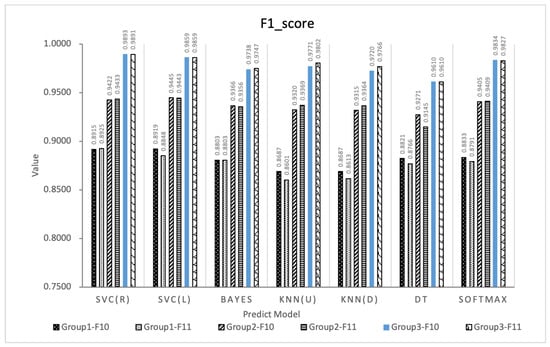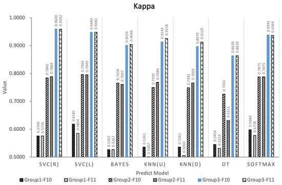 From Figure 8, Figure 9 and Figure 10 comparing the indicators of experimental groups 1, 2, and 3, it can be concluded that, in general, F10 and F11 have the best predictive effect in experimental group 3, which verifies the effectiveness of the feature fusion method.The feature subset F10 in group 3 shows the highest prediction performance, the accuracy, F1-score and kappa of SVC (R) are 98.44%, 0.9893 and 0.9600, respectively. The data of experimental group 1 without any processing obtained the worst experimental results. The average accuracy, F1-score, and kappa values of F10 and F11 under the 7 algorithms were 82.65%, 0.8809, 0.5624 and 81.95%, 0.8764, 0.5432, respectively. The accuracy of experimental group 2 was improved after feature selection, obtaining 90.73%, 0.9363, 0.7655 and 90.57%, 0.9360, 0.7569, respectively. The experimental group 3 uses the feature fusion strategy to further integrate the behaviors of the same category in the feature subset based on the idea of behavior classification, and the indicators under the 7 machine learning algorithms obtain the average accuracy, average F1-score, and average kappa values of F10 and F11 are 96.73%, 0.9775, 0.9177 and 96.89%, 0.9786, 0.9216, respectively. Compared with group 2, group 3 increased by 6.61%, 4.40%, 19.88% and 6.98%, 4.55%, 21.76%, respectively.