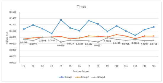 In order to verify that the method proposed in this paper can effectively reduce the computational cost of the model, we recorded the average computation time of the three groups of prediction models for all input indicators, as shown in Figure 11. As can be seen from the figure, group 2 and group 3 are greatly improved compared to group 1. The average calculation time of F0–F14 of group 1 is in the interval of 0.0864 s to 0.1351 s, group 2 is in the interval of 0.0749 s to 0.0888 s, and group 3 is in the interval of 0.0657 s to 0.0813 s. The average of the total time required for the prediction of all feature subsets under each algorithm in the three groups of experiments is1.6450 s, 1.2194 s, 1.0862 s, respectively. The computational speed of group 2 is 25.87% higher than that of group 1, and the computational speed of group 3 is 10.92% higher than that of group 2. The results show that our work can optimize the model structure, reduce the complexity of the model, and increase the speed of computation.
