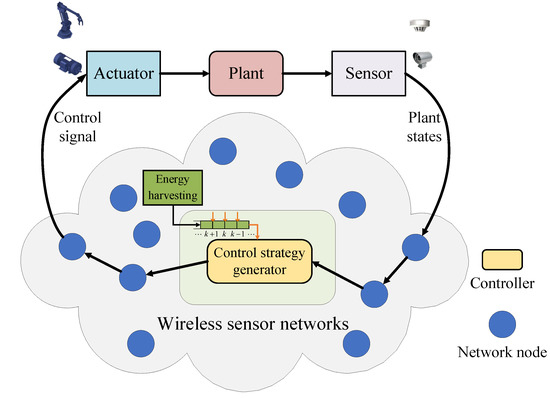 As shown in Figure 1, a typical WSAN, consisting of the controller, plant, actuator, and a number of sensors connected through a shared wireless network is considered [34,35]. In particular, compared with the traditional controller powered by non-rechargeable batteries, a controller with the capability of energy harvesting was considered, in which the energy harvesting devices such as solar panels and micro wind turbines were equipped thus that the controller energy can be harvested from the surrounding environment.