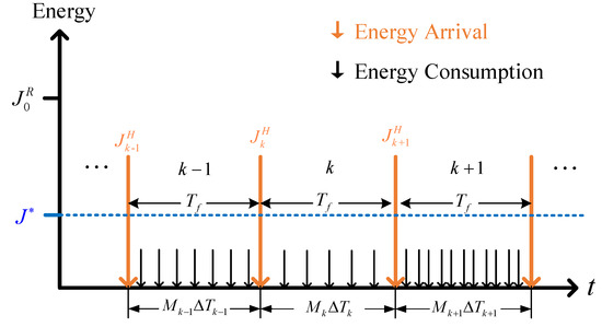 In this subsection, we will describe the energy harvesting and consumption model of how the controller collects, stores, and consumes energy. As shown in Figure 2, the energy arrival may occur at any time, but the harvested energy can only be released at the beginning of the next control frame, which includes sampling intervals at the k-th control frame. While the controller consumes energy due to signal processing and transmission in each sampling interval. In addition, the battery capacity is usually assumed to be infinity because even a small button battery has enough energy capacity to meet the needs of most energy harvesting schemes [38]. The objective of energy harvesting and consumption is to try to improve the system stability based on the joint design of control strategy and adaptive sampling interval through the effective use of harvesting energy. In general, the energy consumption of the controller in the k-th control frame is mainly determined by the signal transmission, which is given by [11]
