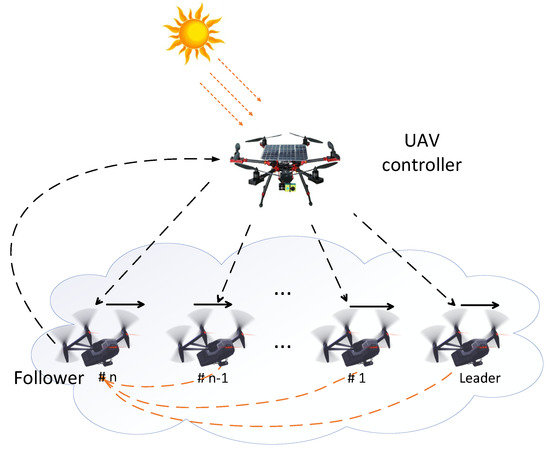 The application of the UAV formation flight system with an energy harvesting controller is provided to show the effectiveness of the proposed three-step optimization algorithm for WSANs. The UAV formation flight system, including a solar-powered UAV controller, a UAV leader, and multiple UAV followers, is shown in Figure 3. The UAV controller collects the position and speed information of the leader. Once the UAV controller receives the state information of the leader, it immediately calculates the control strategy and selects the optimal sampling period according to the situation of solar energy charging and energy consumption in order to maintain the UAV formation flight system stably and efficiently. As a case study, a typical three-UAV platoon traveling on a horizontal path is considered; the UAV formation flight system has one UAV follower, one leader, and a solar-powered UAV controller. The states of UAV formation flight system are given by