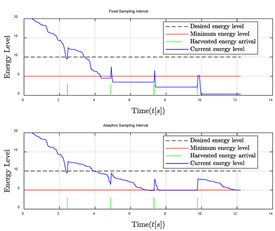 Finally, the general energy harvesting condition is considered in Figure 8 and Figure 9. It can be observed that the performance of the adaptive sampling interval is slightly better when the remaining energy level is high, which is similar to the case of sufficient energy harvesting conditions. While when the remaining energy level is low, the traditional fixed sampling period will suffer significant performance degradation, which is similar to the poor energy harvesting condition.