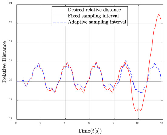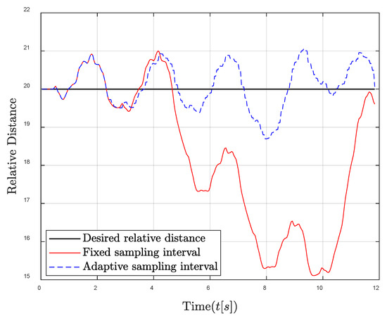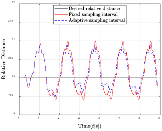 Then, the performances of the proposed algorithm in sufficient energy harvesting conditions are shown in Figure 6 and Figure 7. It can be seen that the remaining energy of the traditional fixed sampling interval gradually increases. This is because the remaining energy cannot be effectively utilized in sufficient energy harvesting conditions due to the fixed sampling interval, and the harvested energy is always greater than the consumed energy in each sampling interval. Fortunately, through the adaptive sampling interval algorithm, the controller energy can be maintained near the required energy level; thus that the remaining energy and harvested energy in each control frame can be fully used to improve the system control performance. Similarly, Figure 7 also shows that the oscillation reduction of the relative distance between the follower and the leader can be achieved by the adaptive sampling interval strategy, especially when the oscillation of the relative distance is large.