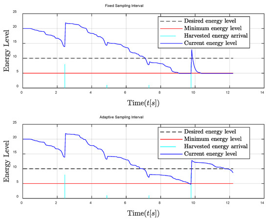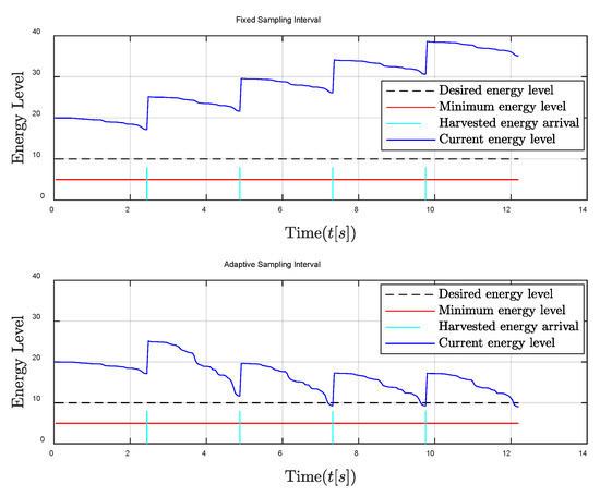 First, the poor energy harvesting condition such as cloudy weather, where the harvested energy is not enough, is investigated. As seen in Figure 4, the energy of the controller using the traditional fixed sampling method decreases rapidly and then suddenly drops below the minimum energy level, which will cause the controller to fail to work. This is because the fixed sampling interval causes more energy to be consumed than harvested, thus that the remaining energy level gradually decreases and may even exhaust the remaining energy to make the control system shut down. Compared with the fixed sampling interval, the energy of the controller using the adaptive sampling interval is also difficult to keep at the expected value due to insufficient energy harvested, but the energy of the controller can still be higher than the minimum energy level to maintain the normal work of the system. This is because the sampling interval is automatically adjusted to become larger to save energy when the remaining energy level is low. The control performance comparison is shown in Figure 5; it can be seen that a significant performance improvement is achieved compared to that of the fixed sampling interval. Especially when the energy level falls below the minimum energy level, the controller cannot work properly; thus that severe control stability degradation is caused in the case of fixed sampling interval.