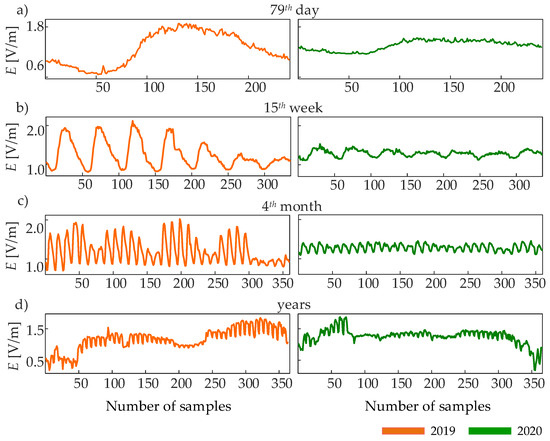 Figure 1 shows a representative time series of the EF intensity observed during a representative day (a), week (b), and month (c) of 2019 and 2020, as well as during the whole year (d). We selected the 79th day, the 15th week, and the fourth month of 2019 and 2020, to compare the EF intensities before and during the COVID-19 pandemic; the series shown in Figure 1a–c is rescaled according to the coarse-graining procedure described in Section 2.2, to demonstrate the oscillations dominant in daily, weekly, and monthly observation windows.