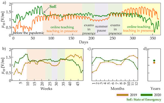 Mean of the EF intensity time series computed over observation windows lasting one day at the time scale min (a), one week at the time scale min (b), one month at the time scale h (c), and one year at the time scale day (d). The colored areas identify periods of different activities in the campus area of the University of Novi Sad, occurring before (2019) and during (2020) the COVID-19 pandemic. The colored areas may differ slightly between the two analyzed years (±a few days).