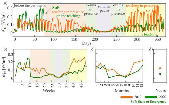 To make the observations above quantitative and confirm them in a complete analysis, we report in Figure 2 and Figure 3 the mean and the variance of the EF intensity observed at the four time scales and computed for each observation window during the two years. While the mean values of the EF intensity measured in 2019 and 2020 are quite similar (Figure 2d: = 1.16 V/m in 2019 and 1.26 V/m in 2020), the dynamic behavior of the mean EF intensity emerges, analyzing the rescaled time series (Figure 2a–c), which display values oscillating between ∼0.2 V/m and ∼1.9 V/m. The trends of the mean EF intensity show oscillatory activity with a period of one week at the finer time scale (Figure 2a), as well as slower variations demonstrated when the time scale becomes more coarse (Figure 2b,c). Given that the oscillations with one-week period observed in the two years (green and orange curves in Figure 2a) exhibit minimum EF intensity during weekends, they can be related to the amount of people present on the university campus. However, when we compare 2019 and 2020, the averaged EF intensity is different between periods of the two years, which are expected to be similar in terms of human presence (e.g., the first three months where is higher in 2019, the last three months where is higher in 2020, and the periods of exams in person and summer pause where is again higher in 2020). This effect is clearly evident observing also the slower trends in Figure 2b,c, thus reflecting the contributions from all detected EF sources in the proximity of an installed sensor. Nevertheless, an effect of the pandemic on the mean EF values occurs in correspondence with the State of Emergency (SoE) declared by the Government of Serbia on 15 March 2020 [41]: starting from this date, wherein strict movement restrictions were implemented, a sudden drop of is visible at the daily and weekly observation windows (Figure 2a,b), and the reduced mean field value of ∼1.3 V/m is maintained during the spring and summer 2020, when a clear reduction in the amplitude of oscillations with one-week period is also observed (light orange, green and grey areas in Figure 2a).