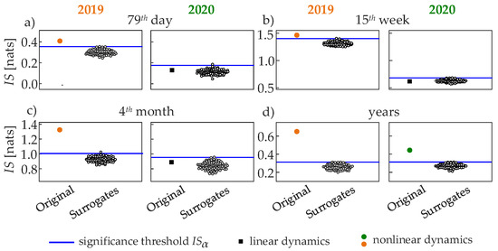 Figure 4 depicts the results the analysis of information storage performed for the representative time series reported in Figure 1, pre-processed as explained in Section 2.2. All the estimates of resulted n being statistically significant according to the test based on randomly shuffled surrogate data, meaning that the null hypothesis of a serially uncorrelated process was rejected for all the series in Figure 1 (data not shown). The amount of information stored in the EF dynamics is always higher for the exemplary time series measured during 2019 than for the series measured in the same period of 2020, with values = 0.42 nats and = 0.2 nats for the 79th day (Figure 4a), = 1.45 nats and = 0.62 nats for the 15th week (Figure 4b), = 1.33 nats and = 0.89 nats for the 4th month (Figure 4c), and = 0.65 nats and = 0.44 nats for the whole year (Figure 4d). The lower values of IS reflect higher complexity of the EF time series, documenting the presence of less predictable, more erratic EF dynamical patterns when human mobility was strictly restricted, i.e., during 2020 due to COVID-19 pandemic, in contrast to one year before when the higher IS values indicate the presence of more regular patterns of EF intensity. Nonetheless, the analysis based on IAAFT surrogate data reveals for all time scales the presence of nonlinear EF dynamics during 2019 (the original value exceeds the surrogate threshold in Figure 4a–d), while, on the contrary, the daily, weekly, and monthly dynamics observed during the same periods in 2020 can be regarded as linear (the original value is below the surrogate threshold in Figure 4a–c). This result distinguishes the nature of oscillations during the periods of normal and restricted mobility, also showing how complexity and nonlinearity are different concepts: in this case, the less complex dynamics (showing higher ) are those with a stronger contribution of nonlinearities ( is higher than the nonlinearity threshold).