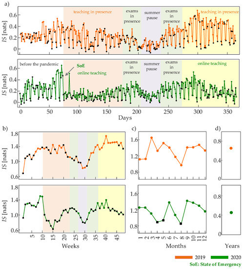 The values of information storage measured over observation windows of different length, each characterized by their peculiar time scale, are reported in Figure 5. The detailed analysis comparing the two considered years of EF recordings sheds further light on the nature of these predictable patterns. In fact, as a consequence of the onset of the COVID-19 pandemic in March 2020 and of the establishment of strict mobility restrictions, the EF intensity time series displays a significant reduction in the values of . The reduced regularity compared with the same period of the preceding year is visible in the EF dynamics observed on a daily basis (Figure 5a, light orange areas) as well as when investigating longer time-scales which cover observation windows of one week (Figure 5b, light orange areas) or of one month (Figure 5c, months 3, 4, 5). The presence of more erratic multiscale patterns of EF intensity is associated with the significantly reduced access of people to the university campus in this period when teaching lessons were delivered in the online modality.