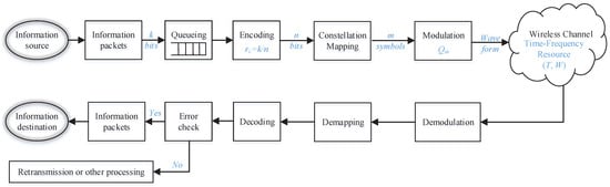 A typical wireless link from the sender to the receiver is described in Figure 1, which includes all necessary modules to be used for the analysis in this work. The transmission starts from the information source, who generates information packets. As suggested in [15], the arrival of URLLC information packets is usually assumed to follow periodical model with fixed length. Here, let k denote the length of information packet. Then, an information packet will be transmitted out through one link or be duplicated and transmitted through multiple links. Data duplication, instead of Automatic Repeat Request (ARQ), is preferred for URLLC traffic to meet the reliability requirement, because ARQ requires retransmission after feedback from packet error detection at the receiver causing higher delay. Therefore, data duplication has been proposed for use in 5G NR system and beyond to achieve low latency while ensuring high packet success probability.