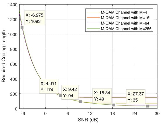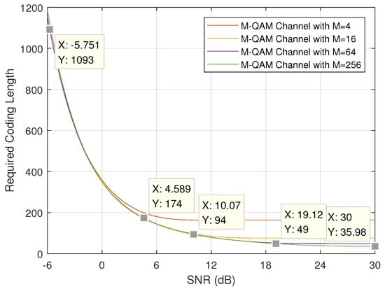 First, we discuss the minimum required coding length under different SNRs. Figure 3 and Figure 4 show the theoretical results when the length of URLLC information bits k and error probability are set to and , respectively. It is easy to notice that, when channel quality is good (i.e., SNR P is large) and modulation order is high (i.e., M is large), the required coding length will be short. These two figures plot the theoretical lower bound on coding length. When considering the practical MCS schemes defined in Table 2, the application feasibility and condition should be carefully discussed.