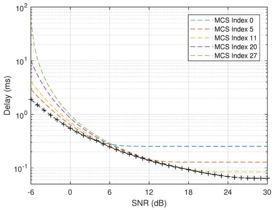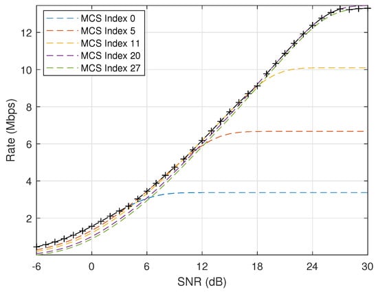 Figure 6 plots the theoretical transmission rate when bits and under different MCS schemes. It is obvious that the transmission rate will be significantly improved when SNR increases or more efficient MCS scheme is applied. In addition, the curve with maker “+“ is composed of those transmission rates after considering adaptive MCS selection with SNR thresholds given in Table 4. It can be seen that optimal rates can be achieved after applying adaptive MCS selection.