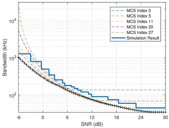 Based on Theorem 1 and Corollary 1, the minimum bandwidth derived theoretically under certain QoS requirement and certain SNR can be obtained as shown by the slashed lines in Figure 8, where the QoS constraint is ms, ). The curves under fixed MCS schemes are ploted. In addition, the curve with marker + is composed of the minimum bandwidth among all MCS schemes considering adaptive MCS selection in different SNR ranges, and this curve can be used as admission region for QoS constraint of ms, ).