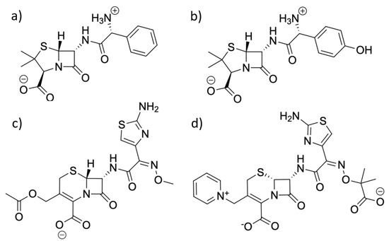 Structures of the four ligands used for simulation in this work: (a) ampicillin, (b) amoxicillin, (c) cefotaxime, and (d) ceftazidime.