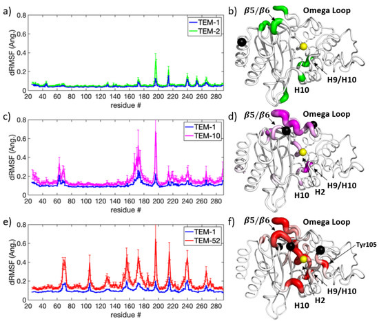 Figure 5 shows the respective dRMSF for pairwise comparisons of TEM-2 (Figure 5a,b), TEM-10 (Figure 5c,d), and TEM-52 (Figure 5e,f) mutants versus wild-type TEM-1 in apo form. In comparing dynamic changes that occurred in the ESBL mutants TEM-10 and TEM-52 and not in the NSBL mutant TEM-2, the omega loop (residues 163-178) and the start of H2 (including the catalytic Ser70) experience the greatest change. Overall, both ESBL enzymes showed larger fluctuations in their discriminant motions, reaching up to Å compared to Å for TEM-2, suggesting that mutations conferring extended spectrum resistance have a greater impact on enzyme dynamics. It is noteworthy that all three mutants exhibit a large discriminant motion at the H9-H10 loop (residues 194-201). An increase in conformational fluctuations in all three mutants, regardless of the specificity of the enzyme substrate, suggests that this loop is important for protein stability.