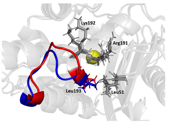 The MD/SPLOC results suggest that the H9-H10 loop plays a key stabilizing role, which is in agreement with previous work [57] postulating that loops transmit allosteric signals through the H9-H10 loop, resulting in the observed high fluctuations. This loop (shown in Figure 10) connects two helices that are almost perpendicular to each other. The H9 helix at the beginning of the loop shields the back of the H2 helix and the catalytic serine 70 from solvent. This loop sterically counters a resultant push back of the H2 loop when it binds to an antibiotic. From the simulation data, Leu194 braces Leu51 on the nearby - connector loop. Mutations such as Leu51Pro, Leu51Phe, or Leu51Ile (e.g., in TEM-60) have been shown to increase the stability of TEM-1 beta-lactamase [17,60], which supports this hypothesis. Additionally, residue Lys192 has been observed to form an intermittent interaction with Gly196, and disruption of this favorable interaction should provide the means for greater flexibility.