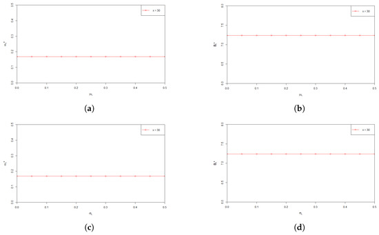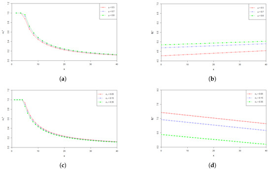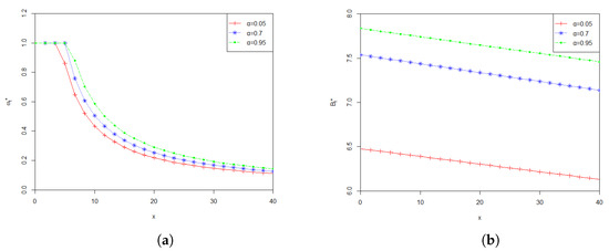 Effects of model main parameters , and on and are shown in Figure 2. The graphs in Figure 2a–f plot the values of the optimal investment proportion and the optimal payment rate with respect to the wealth x at time 0, when the parameters , and influencing the stock’s price change. From Figure 2a,b, we can find that the values of and increase as increases. This is consistent with the intuition that when the return rate of the stock becomes higher, the pension fund manager would naturally like to invest more in the stock to make more profit. At the same time, the pension fund manager is able to pay more to the retirees who participate in the plan. From Figure 2c–f, we can see that and decrease as and increases, respectively. The corresponding economic explanation is as follows. Higher values of and represent higher uncertainty of the fluctuation of the price of the stock. In other words, the higher the values of and are, the more risky the stock is. Therefore, a risk averse pension fund manager would most likely to reduce the amount invested in the stock, and has to lower the payment rate to the pension members because of the reduction of the profit from the stock market.