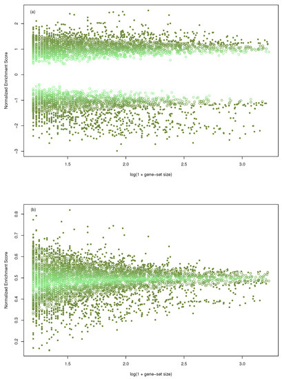 We considered the gene-sets collection C5/BP from MSigDB [19] and the gene-profile published in [16]. Due to gene-set size, GSEA restricted the original collection to 4046 out of 7658. The same collection was used with mGST. In Figure 1, the size of the gene-sets (transformed as ) has been plotted against the normalized enrichment score, both for GSEA (a) and mGST (b). The range of NES decreases as the size increases in both cases, showing a dependence. Furthermore, we measured the intensity of the dependence with the mutual information (computed with k-NN estimator implemented by [20]) obtaining , and .
