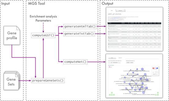 A simplified functional architecture of the mGST Tool is shown in Figure 2. It is implemented in Javascript and is executed on the client host. Gene-set pre-elaboration is performed by the prepareGeneSets() function. Basically, it computes gene-profile ranking in time, where m is the length of the gene-profile, and collects global information in appropriate data structures, such as the total number of genes and the sum of ranks.