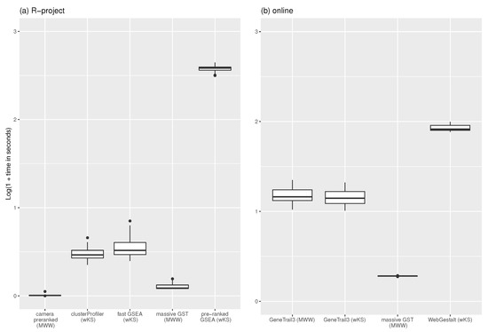 The 30 gene-profiles, together with the C1 collection of 278 positional gene-sets from MSigDB [19], fed the nine procedures. Table A1 shows the computational time (in seconds) measured on a PC running Ubuntu with Kernel Linux 5.4.0-73-generic x86_64 (4 cores, 16 GB RAM), and Google Chrome Version 90.0.4430.212 (64-bit). Figure 4 shows a boxplot of the experiment results. The time has been transformed as to bound the different ranges of each procedures. Camera pre-ranked (on average 0.02 s with 0.03 as standard deviation) and massive GST (0.27 s with 0.10 as standard deviation) own the lowest computation time in the R environment, confirming results reported in [23]. The time difference between massive GST and camera pre-ranked is because the latter applies the MWW’s test and returns the p-value with an indicator of the direction of the test; instead, massive GST provides the statistics presented in the methodology section. As online service, our proposal spends 0.91 s on average (sd = 0.01), versus 13.57 (sd = 3.01) of wKS (GeneTrail3) and 14.30 (sd = 3.13) of MWW (GeneTrail3). WebGestalt (wKS) spends 84.20 s (sd = 6.69).