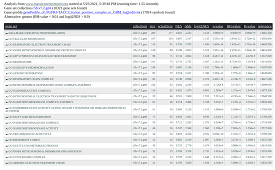 Screenshot of the tabular results of the gene-profile associated with FGFR3-TACC3 fusion positive samples in GBM. C5 and Hallmark collections (in total 10,321 gene-sets) from MSigDB interrogated the gene-profile in 1.55 s.