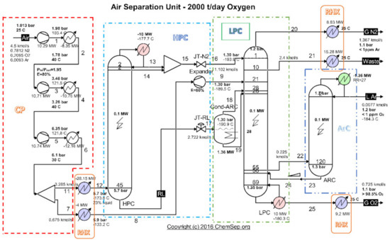 Schematic of the cryogenic air separation installation–functional areas. Source: Harry Kooijman (2006) chemsep.org [26].
