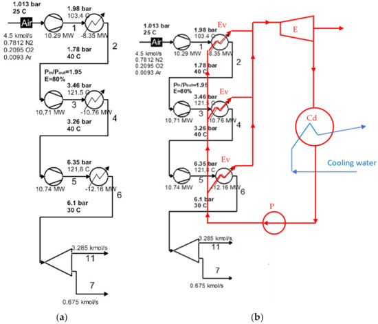 Schematic of the compression area of the cryogenic air separation unit: (a) the initial compression area; (b) schematic of the use of ORC for intermediate and final cooling of compressors.