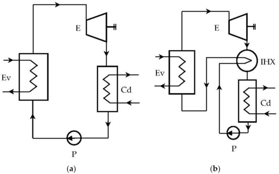 Rankine system with organic fluids: (a) ORC system without internal heat exchanger (IHX); (b) ORC system with IHX.