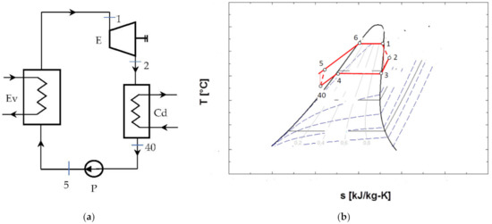 ORC system without overheating of the vapors at the entrance to the expander and without internal recuperative heat exchanger: (a) flow chart; (b) representation in the T-s diagram of the ORC cycle.