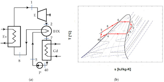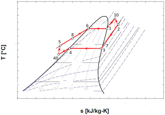 The diagram of the ORC system with internal heat exchanger recuperator, and the representation of the cycle in the diagram T-s, are presented in Figure 5.