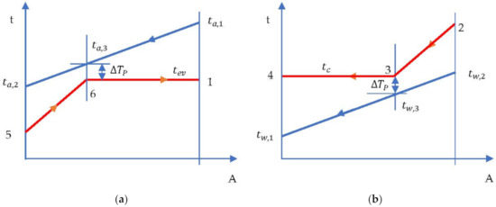 Figure 7. ORC cycle without overheating and without internal heat exchanger. Temperature-area of heat transfer (t-A) diagram: (a) evaporator; (b) condenser.