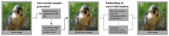 As mentioned above, we constrained the units of modification and used the BP–DE method to search the decision boundary in 3D space, generating an adversarial sample at a cost of three pixel points. In order to reduce the intensity of the modified pixels such that the perturbation is not visible, we used the LSB algorithm for data hiding. The LSB algorithm embeds the information in N individual pixel points, which are the ”sensitive pixels” at the decision boundaries just selected by the BP–DE algorithm. The secret information is encoded in the lowest valid bit of each of N individual pixels, and changing this position has no influence on the carrier image’s quality. It is only necessary to read the position of these N individual pixel points out of storage and then decode them when the data is to be read out. This measure reduces the intensity of modification, improving the security and concealment of ADH. The ADH algorithm, including the information hiding process, is shown in Algorithm A1 of the Appendix A.