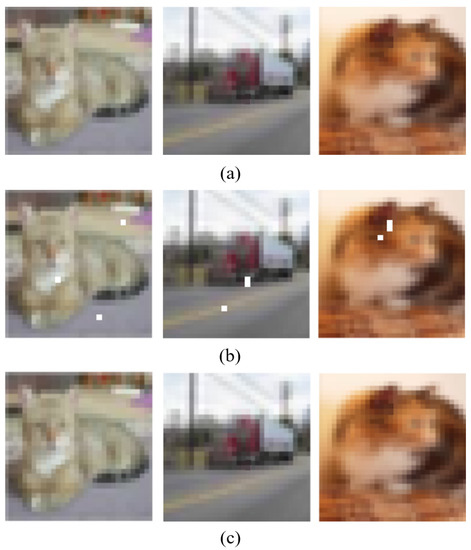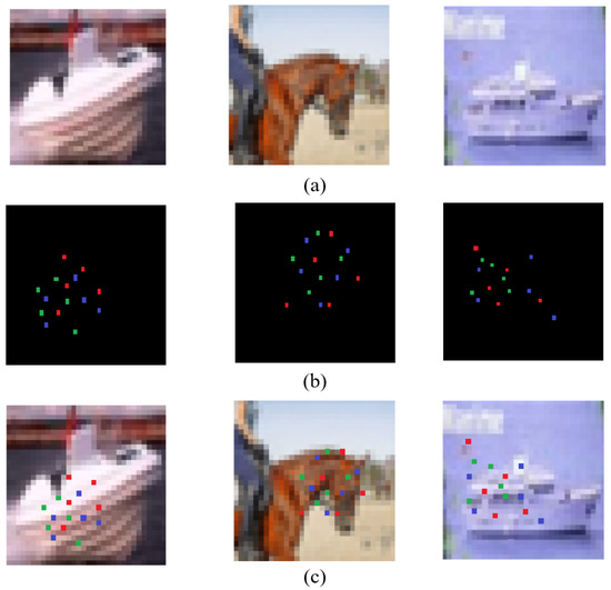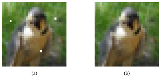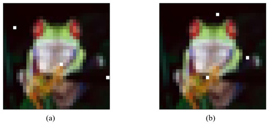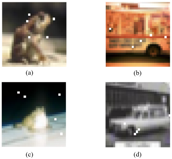 As shown in Figure 7, after limiting the modification unit and constraining the amount of modified pixels, it is possible to locate the decision boundary in the search space using BP–DE. The ordinary sample can become adversarial by randomly selecting discontinuous “sensitive pixels” on the decision border and changing the color of these pixels to make them perturbations. It is worth noting that the CNN network can misclassify both of the Figure 7 adversarial samples, although their ”sensitive pixel” positions are not the same. Furthermore, as shown in Figure 7a,b, when different “sensitive pixels” are selected the discriminator performs different classes of misclassification. This demonstrates the BP–DE algorithm’s randomness and shows that the BP–DE algorithm actually scans the search space for decision boundaries and finds discontinuous ”sensitive pixels.”