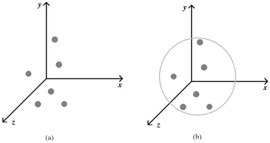 For the original sample x, represents the required number of perturbed pixels, t, and N is the minimum number of pixels that have been modified. Previous work changed a fraction of all dimensions; however, the current method only changes dimension t, maintaining the other dimensions of x unchanged. As in Figure 2, these images show what a modified dimension would look like if it were in five dimensions. Because we decided to create a three-dimensional search space, in this paper . As in Figure 3, the three-dimensional Euclidean space is a three-dimensional space. When there are only sensitive pixels and no limit, as shown in Figure 3a, it is difficult to find them or the image quality is greatly damaged when they are changed. Limiting them to a suitable range, as shown in Figure 3b, allows for minor modifications.