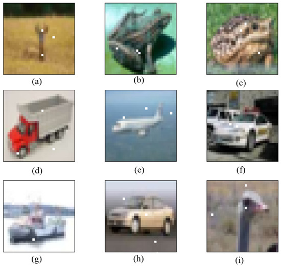 As shown in Figure 8, the BP–DE algorithm, as described in Section 2, makes the ADH flexible and suitable to a wide range of CNNs. In Lenet, as shown in Figure 8a–c,g,i, the true labels are respectively deer, frog, frog, ship, and bird. However, the predicted labels are respectively dog, automobile, deer, automobile, and dog. In Resnet, as shown in Figure 8f,h, the true labels are automobile and airplane, respectively, while the predicted labels are truck and truck, respectively. In Net in Net, as shown in Figure 8d,e, the true labels are truck and airplane, respectively, while the predicted labels are airplane and ship, respectively. As a result, it can be trained on different networks to generate adversarial samples, and the adversarial samples thus generated can successfully fool the CNNs. This can explain why we were able to cut down the number of modification units. We only modified three pixels and successfully affected a large number of images, as the CNN is sufficiently sensitive to tiny perturbations.