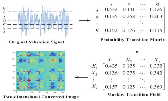 The main contributions of this paper are as follows. Firstly, a new method of converting time series data into figures using the Markov transformation field (MTF) [] is introduced. MTF is based on the Markov transition matrix, which is obtained from the first-order Markov chain. Due to the memorylessness of the Markov chain, the current elements in the Markov matrix are independent of the previous element, which results in the loss of much information in the conversion process. By introducing the time axis, more time information can be retained during the conversion process; therefore, the MTF transforms time series into corresponding images, which can decrease information loss. Then, via the CNN model applied in this paper, by reducing the level of convolutional layers and optimizing the parameters of the fully connected layer, the operating efficiency is improved. Finally, by combining the MTF with the CNN model proposed (MTF-CNN), a new method for fault diagnosis of rolling bearings is proposed.