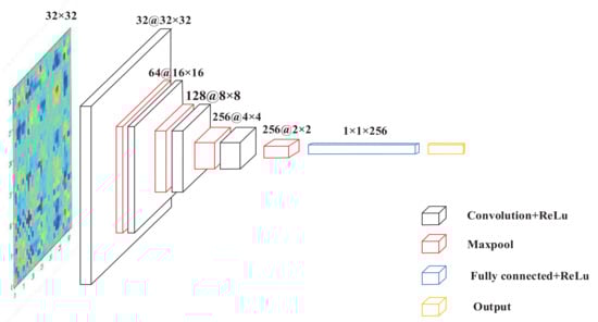 The convolution kernel sizes of the convolutional layers , , and are all , the input images of each layer are filled with zero elements. According to the Equation (11), the size of the output image of each convolutional layer can be calculated. The activation unit used in the convolution layer and pool layer are ReLU. The activation function introduces nonlinearity to the CNN, which is advantageous in solving complex problem. In the layers, the number of neurons set are 256. The output layer includes a FC layer and a softmax classifier.