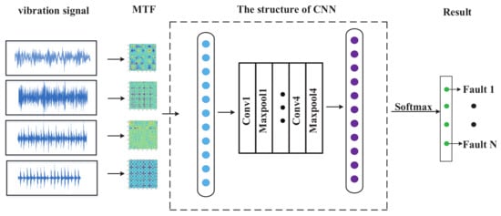 Based on the theory of MTF and CNN, a method called MTF-CNN is proposed, which can accurately and effectively complete the fault classification. The process of MTF-CNN is illustrated in Figure 3, and the specific steps are shown below: