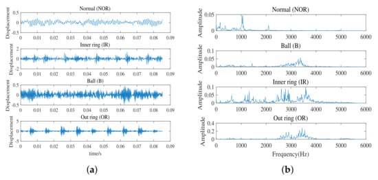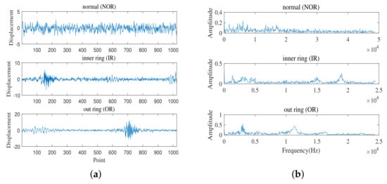 The CWRU platform mainly contains three parts. The left end is a two horsepower motor, the middle part is a torque sensor and the right end is a power meter. The electrical discharge machining technology is used to punch out the fault point on the bearing, and its fault range is inches to inches. We collected a data set containing the normal (NOR) conditions of the rolling bearing and the other three failure conditions (inner race (IR), outer race (OR) and ball (B)). The bearing data parameters used in this paper: sampling frequency is 12 kHz, bearing speed is 1797 rpm, load is 0HP. A total of 1024 points in the vibration signal are taken as a sample, and the sampling time is 0.0853 s. Figure 5 shows the original vibration images and corresponding spectra in the CUWR dataset under four different working conditions.